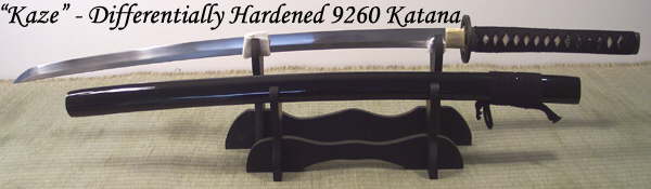 The Kaze (Wind) is the result of many popular requests for a clay tempered (hardened) blade using our 9260 Silicon Alloy Spring Steel. The blade body of the Kaze is a hand clayed and differentially heat treated 9260 silicon carbon spring steel. It is finished with a replica of an antique blackened cast steel tsuba submitted to us. This steel is stronger than our Kanbai katana, but does not have the same resiliency of the through hardened 9260. The gain from the clay hardening is that the blade has a smooth and elegant natural hamon (9260 does not generate the same hamon as the Kanbai katana).